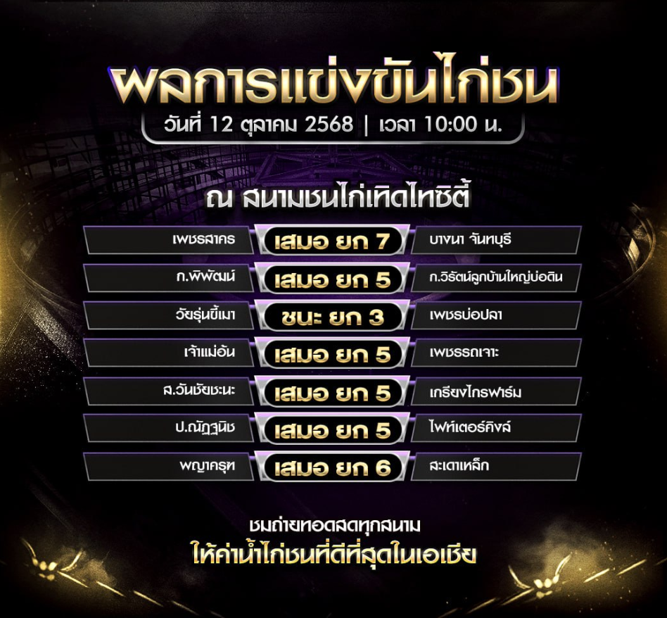 ผลไก่ชน วันที่ 12 ตุลาคม 2025 สนามชนไก่เทิดไทซิตี้